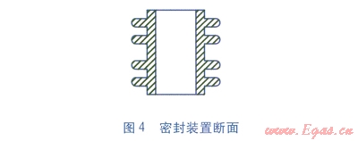端部出線位置在保溫結(jié)束處,出線電纜采用三芯電纜接入保溫管,其中兩根導(dǎo)線分別連接兩根信號(hào)導(dǎo)線,第三根導(dǎo)線連接工作鋼管。端部出線方式分為兩種:第一種,通過(guò)安裝在保溫層堵板上的密封裝置引出,主要用于進(jìn)入建筑物內(nèi)部管道的信號(hào)電纜出線,見(jiàn)圖2。第二種,通過(guò)安裝在PE保護(hù)層上的密封裝置引出,主要用于建筑物外部管道的信號(hào)電纜出線,見(jiàn)圖3。密封裝置斷面見(jiàn)圖4。