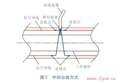 中間出線用于將整個(gè)管網(wǎng)分成若干一定長(zhǎng)度的管段,以滿(mǎn)足監(jiān)測(cè)儀最大監(jiān)測(cè)管段長(zhǎng)度的需要。出線電纜采用五芯導(dǎo)線,其中四根導(dǎo)線分別連接4根信號(hào)導(dǎo)線,第五根導(dǎo)線連接工作鋼管,出線電纜通過(guò)密封裝置引出,見(jiàn)圖5。