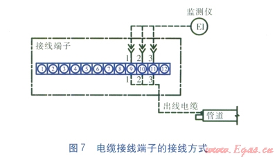 為了將監(jiān)測(cè)儀方便地接入監(jiān)測(cè)系統(tǒng),在監(jiān)測(cè)點(diǎn)附近沒(méi)置電纜接線端子。電纜接線端子可以方便接入監(jiān)測(cè)儀、接通或斷開(kāi)出線電纜,接線方式見(jiàn)圖7。電纜接線端子置于專(zhuān)門(mén)設(shè)備箱內(nèi),根據(jù)熱網(wǎng)規(guī)模和走向需要布置若干個(gè)設(shè)備箱,并安裝在干燥及通風(fēng)良好的環(huán)境中。對(duì)于相對(duì)濕度較高的場(chǎng)所,應(yīng)采用密封設(shè)備箱。