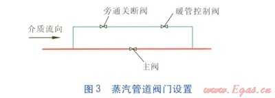 蒸汽管道的啟動需要有一個(gè)暖管過程。CJJ 34—2010第8.5.10條要求“蒸汽管道啟動暖管需控制流量時(shí),管道閥門應(yīng)裝設(shè)口徑較小的旁通閥作為控制閥門”。這是由于主閥口徑較大時(shí),若暖管過程使用主閥小開度暖管,高速蒸汽通過主閥小開度的縫隙,蒸汽分子或管道內(nèi)的其他微小雜質(zhì)顆粒沖刷密封面,使密封面遭到破壞。CJJ 34—2010要求蒸汽管道啟動暖管需控制流量時(shí)管道閥門應(yīng)裝設(shè)口徑較小的旁通閥作為控制閥門無疑是正確的,因?yàn)檫@樣做可以保護(hù)大口徑主閥。但是還應(yīng)該注意小口徑旁通閥的時(shí)徑和閥門類型的合理選擇,根據(jù)我們的實(shí)踐經(jīng)驗(yàn),小口徑旁通閥的口徑應(yīng)按主閥口徑的1/10選取,但最小不應(yīng)小于DN 50mm。而且小口徑旁通閥應(yīng)設(shè)置兩個(gè)(見圖3),一個(gè)作為暖管時(shí)的控制閥,另一個(gè)作為旁通管的關(guān)斷閥,這兩個(gè)小口徑閥門均應(yīng)選擇截止閥。這是因?yàn)檎羝軙r(shí)間較長,有時(shí)候控制閥暖管時(shí)的開度仍然較小,仍然有較大可能因高速蒸汽通過控制閥小開度的縫隙時(shí)將控制閥的密封面破壞,如果不再設(shè)置一個(gè)旁通關(guān)斷閥,一旦暖管控制閥的密封面被破壞,主閥的關(guān)閉將起不到關(guān)斷管路的作用。