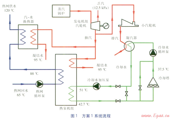 發(fā)電機(jī)組汽輪機(jī)抽汽作為熱泵機(jī)組驅(qū)動(dòng)蒸汽,低溫?zé)嵩礊樾∑啓C(jī)凝汽器冷卻水余熱。方案1的系統(tǒng)流程見(jiàn)圖1。系統(tǒng)流程可分為3個(gè)分項(xiàng)流程:a.熱網(wǎng)循環(huán)水流程:熱網(wǎng)回水65℃,經(jīng)熱泵機(jī)組加熱至88℃后,進(jìn)入汽—水換熱器加熱至l20℃作為熱網(wǎng)供水。b.發(fā)電機(jī)組汽輪機(jī)抽汽流程:不考慮小汽輪機(jī)用汽,發(fā)電機(jī)組汽輪機(jī)抽汽分為兩部分,一部分作為熱泵機(jī)組驅(qū)動(dòng)蒸汽,另一部分進(jìn)入汽—水換熱器加熱熱網(wǎng)回水,兩部分凝結(jié)水溫度均為95℃,并由汽動(dòng)給水泵加壓輸送回蒸汽鍋爐。c.凝汽器冷卻水流程:小汽輪機(jī)凝汽器出口冷卻水溫度為51℃,作為熱泵機(jī)組低溫?zé)嵩?,余熱利用后溫度降?span lang="EN-US">42.7℃,經(jīng)冷卻塔進(jìn)一步降溫后(冷卻塔出水溫度為37.5℃)進(jìn)入凝汽器。
