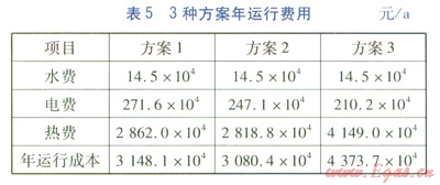 3種方案年運(yùn)行費(fèi)用見(jiàn)表5。水價(jià)按2元/t計(jì)算,電價(jià)按0.3707元/(kW·h)計(jì)算,蒸汽熱價(jià)按18元/GJ計(jì)算。由表3可知,方案1的系統(tǒng)造價(jià)最高,其次為方案2,方案3的系統(tǒng)造價(jià)最低。由表5可知,方案2的年運(yùn)行費(fèi)用最低,其次為方案1,方案3的年運(yùn)行費(fèi)用最高。將方案3作為對(duì)比方案,方案1、2高出的系統(tǒng)造價(jià),分別在2.8、2.4a時(shí)可以收回??紤]年運(yùn)行費(fèi)用,方案1、2的整體經(jīng)濟(jì)性優(yōu)于方案3,且方案1、2的差距不大。