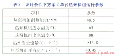 由于熱泵機(jī)組低溫?zé)嵩礊榉ζ?,熱泵機(jī)房宜設(shè)置在空冷島附近,且機(jī)房占地面積不宜過(guò)大,選擇2臺(tái)制熱能力為48.5MW的熱泵機(jī)組,3臺(tái)換熱能力為45MW的汽—水換熱器。方案2的運(yùn)行策略與方案1一致,設(shè)計(jì)條件下(室外溫度為-22℃),方案2單臺(tái)熱泵機(jī)組運(yùn)行參數(shù)見(jiàn)表2。