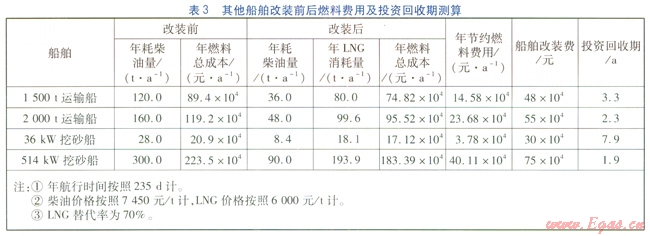 對于柴油—LNC雙燃料船舶,LNG替代約70%的燃油時(LNG替代率為70%)發(fā)動機運行穩(wěn)定,即LNG與柴油使用比例(質量比)約為7:3。根據(jù)柴油—LNG雙燃料船舶運行經(jīng)驗數(shù)據(jù)可知,船舶油改氣后預計能節(jié)約16%~20%的燃料成本,運營企業(yè)的贏利能力將因此大大增強。