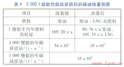 根據(jù)國家發(fā)改委提供的能源碳排放量計算方法,LNG與燃油的碳排放強度系數(shù)分別為0.27和3.18,即每消耗1kg LNG產(chǎn)生0.27kg的CO2,每消耗1kg燃油產(chǎn)生3.18kg的CO2,據(jù)此對2000t級散貨船改裝前后的碳減排量進行測算比較,見表4。