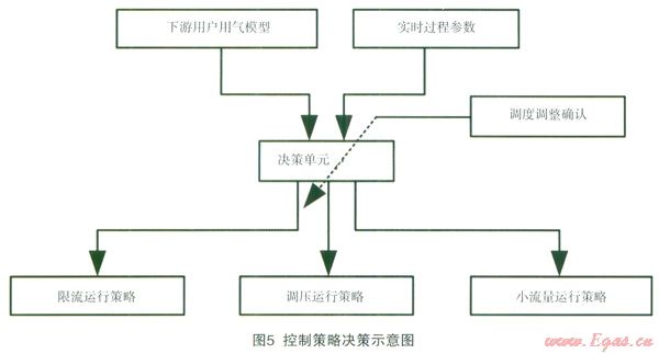 如圖5所示:通過(guò)天然氣用氣流量模型,預(yù)測(cè)下游用戶(hù)一天內(nèi)天然氣用量的流量-時(shí)間分布數(shù)據(jù),判斷出用氣高峰時(shí)段和低谷時(shí)段,同時(shí)結(jié)合實(shí)際運(yùn)行過(guò)程參數(shù)數(shù)據(jù),計(jì)算出相應(yīng)不同時(shí)段的運(yùn)行壓力數(shù)據(jù),在此基礎(chǔ)上調(diào)度人員根據(jù)經(jīng)驗(yàn)做出調(diào)整確認(rèn)后,下載到本地控制器中執(zhí)行具體的控制。