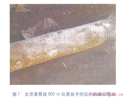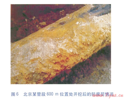 在128Hz電流測(cè)量信號(hào)的結(jié)果中(見圖4),在600m和800m左右的位置上,出現(xiàn)了防腐層質(zhì)量較差的情況,對(duì)兩處位置進(jìn)行定位和開挖,開挖坑內(nèi)防腐層的情況分別見圖6、7。