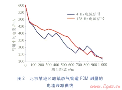 下面以北京某地區(qū)的燃?xì)夤艿罏槔M(jìn)行分析。該段管道全長(zhǎng)約1000m,防腐層的類型為石油瀝青,管道規(guī)格為DNl50mm。該管段所處環(huán)境比較復(fù)雜,有小區(qū)、道路等,受干擾較為嚴(yán)重。PCM檢測(cè)時(shí),信號(hào)發(fā)射機(jī)發(fā)射的電流為600mA,信號(hào)類型為ELCD。在對(duì)防腐層進(jìn)行檢測(cè)時(shí),分別選擇了4Hz電流信號(hào)和128Hz電流信號(hào)的檢測(cè)結(jié)果進(jìn)行比對(duì),該段管道PCM測(cè)量的電流衰減曲線見圖2。