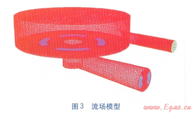 將在GAMBIT下建立的網(wǎng)格模型導(dǎo)入FLUENT中,得到如圖3所示的流場模型。因流場中氣體的流動速度不高,可將模型視為一個定常不可壓縮流體的層流穩(wěn)態(tài)求解問題。采用FLUENT軟件缺省的分離求解器。操作環(huán)境設(shè)置在一個標(biāo)準(zhǔn)大氣壓下,考慮2軸負(fù)方向的重力加速度,在設(shè)置邊界值時充分利用樣機試驗過程中所獲得的參數(shù)(如表l所示),運用層流計算狀態(tài)下的組分輸運模型,假設(shè)試驗中的家用天然氣只含有CH4組分,并基于非結(jié)構(gòu)化網(wǎng)格下的SIMPLE算法對整個模型進(jìn)行模擬分析。