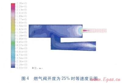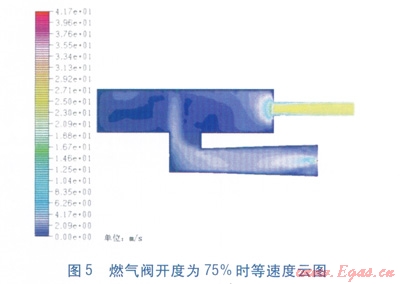 利用FLUENT軟件對比模擬了燃?xì)忾y開度為25%和75%兩種條件下爐腔內(nèi)的氣體流動狀態(tài)。計算得出兩種狀態(tài)下整個爐腔內(nèi)氣流的最高流速分別為24.61m/s和46.86m/s。高速流主要出現(xiàn)在爐腔排氣導(dǎo)管。
