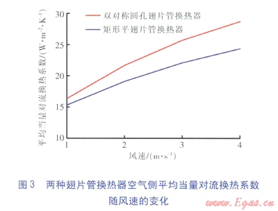 對稱圓孔翅片管具有優(yōu)越的強(qiáng)化傳熱效果。風(fēng)速范圍為l~4m/s時,與矩形平翅片管換熱器相比,對稱圓孔翅片管換熱器的換熱量平均提高了12.8%,空氣壓力降提高并不明顯。