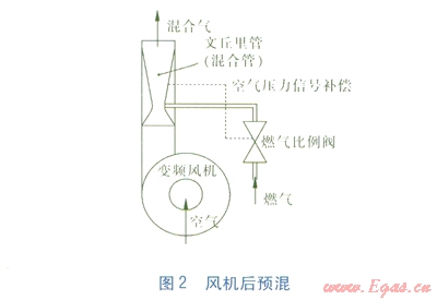 目前市場上的全預(yù)混冷凝式燃氣壁掛爐(以下簡稱全預(yù)混壁掛爐)主要有風(fēng)機前預(yù)混、風(fēng)機后預(yù)混兩種,分別見圖l、2。變頻風(fēng)機、燃氣比例閥[2-3]提供燃燒所需的空氣與燃氣,空氣與燃氣按設(shè)定好的空燃比進行混合燃燒。