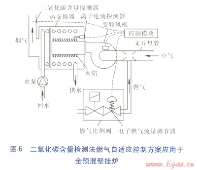 二氧化碳含量探測法燃氣自適應(yīng)控制方案應(yīng)用于全預(yù)混壁掛爐見圖6。其控制原理為:二氧化碳含量探測器對煙氣中的二氧化碳含量進行實時監(jiān)控,控制模塊接收二氧化碳含量探測器的信號,對信號進行邏輯分析。當(dāng)二氧化碳含量偏離設(shè)置值時,控制模塊會迅速輸出電信號給電子燃氣流量調(diào)節(jié)器及變頻風(fēng)機,進行控制參數(shù)調(diào)整,從而調(diào)整空燃比,使煙氣中的二氧化碳體積分數(shù)恢復(fù)到9%左右。需要說明的是二氧化碳含量檢測法燃氣自適應(yīng)控制方案中也要有離子電流探測器,用以判斷火焰是否存在。