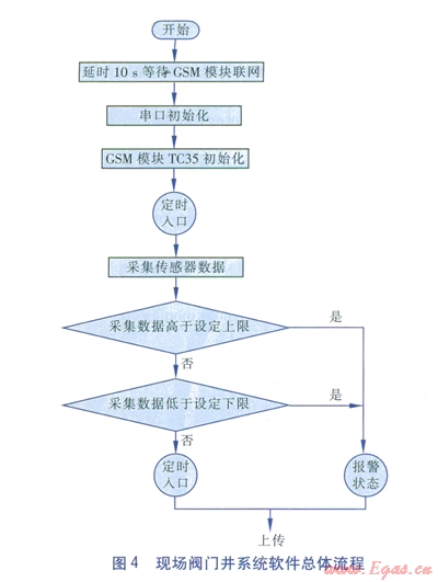 現(xiàn)場(chǎng)閥門(mén)井系統(tǒng)軟件總體流程見(jiàn)圖4,分為串口初始化程序、TC35初始化程序、壓力及燃?xì)鉂舛刃盘?hào)采集程序、壓力及燃?xì)鉂舛刃盘?hào)數(shù)據(jù)上傳程序、短信報(bào)警程序及近程報(bào)警程序,都利用C語(yǔ)言進(jìn)行編程。
