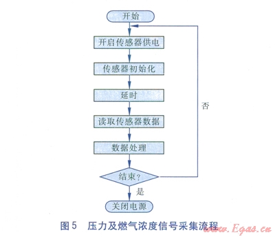 系統(tǒng)按照設(shè)定頻率,定時(shí)啟動(dòng)數(shù)據(jù)采集,采集過(guò)程嚴(yán)格控制傳感器供電時(shí)間,既充分考慮了低功耗需求,又可以避免供電時(shí)間太短造成傳感器數(shù)據(jù)未達(dá)到穩(wěn)定水平。壓力及燃?xì)鉂舛刃盘?hào)采集流程見(jiàn)圖5。