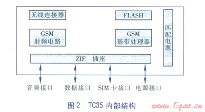 在野外閥門(mén)井監(jiān)測(cè)點(diǎn)和調(diào)度中心,數(shù)據(jù)的接收和發(fā)送采用GSM模塊TC35,它具有語(yǔ)音呼叫、數(shù)據(jù)呼叫、短消息等多種功能,本系統(tǒng)主要采用GSM模塊TC35的短消息接收和發(fā)送功能,模塊內(nèi)部結(jié)構(gòu)見(jiàn)圖2。