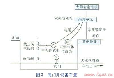 天然氣是易燃易爆氣體,野外閥門(mén)井又是一個(gè)相對(duì)密閉的空間環(huán)境,因此,一旦發(fā)生天然氣泄漏并達(dá)到爆炸極限,遇點(diǎn)火源就會(huì)引發(fā)爆燃事故。為此,該系統(tǒng)采用了防爆設(shè)計(jì),閥門(mén)井內(nèi)安裝的壓力傳感器及可燃?xì)怏w傳感器均采用本質(zhì)安全型儀表,而非防爆的采集單元?jiǎng)t部署在距離閥門(mén)井超過(guò)4.5m的設(shè)備安裝桿上,并使用安全柵與井內(nèi)壓力和可燃?xì)怏w傳感器進(jìn)行電氣隔離,從根本上滿(mǎn)足了防爆要求[5],詳見(jiàn)圖3。