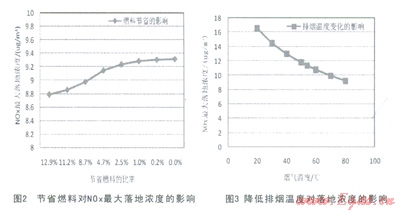 (2)最大落地濃度的影響分析得出:因為節(jié)能的燃料節(jié)省和排煙溫度降低均對最大落地濃度產(chǎn)生影響,隨著燃料的節(jié)省,最大落地濃度減小,隨著排煙溫度的降低,最大落地濃度增加。排煙溫度降低對落地濃度的影響更為顯著使得總的趨勢是隨著排煙溫度的降低,最大落地濃度增大。