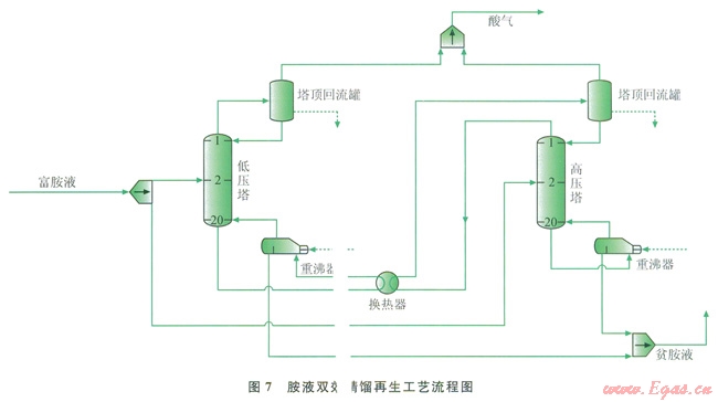 圖7為應(yīng)用ProMax軟件模擬醇胺溶液雙效精餾再生工藝流程。將胺液再生過程分為高、低壓2個(gè)再生塔,高、低壓塔分別得到等量從吸收塔中出來的醇胺溶液,各塔處理量為原再生塔的一半。在高壓塔頂增加冷凝器,并在低壓塔底配置再沸器,以避免低壓塔的塔底液體加熱量達(dá)不到分離要求所需的溫度,同時(shí)避免高壓塔頂?shù)臍怏w冷卻量達(dá)不到冷卻量要求。