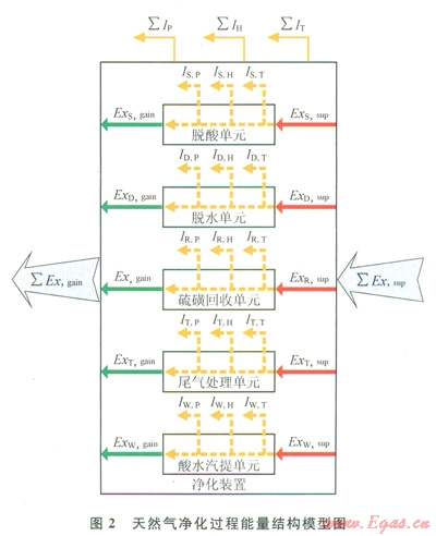 依據(jù)天然氣凈化過程能分析所確定的凈化過程3種炯損失,并借鑒“白箱”分析模型將各天然氣凈化操作單元視為一個(gè)“白箱”,每個(gè)“白箱”內(nèi)的損失為動(dòng)量損失、傳熱損失和傳質(zhì)損失3部分,從而建立了如圖2所示的天然氣凈化過程能量結(jié)構(gòu)模型,圖2中∑Exsup和∑Exgain為外界供人凈化過程的能及產(chǎn)品凈化天然氣物流獲得的能;∑Exs,sup和∑Exs,gain為脫酸氣單位供人和獲得的能;∑ExD,sup和∑ExD,gain為脫水單位供人和獲得的能;∑ExR,sup和∑ExR,gain為硫磺回收單位供入和獲得的能;∑ExT,sup和∑ExT,gain為尾氣處理單位供人和獲得的能;∑ExW,sup和∑Exw,gain為酸水汽提單位供入和獲得的能;∑Ip、∑IH、∑IT,分別為凈化過程產(chǎn)生的動(dòng)量損失、傳熱損失和傳質(zhì)損失;IS,P、IS,H、IS,T分別為脫酸氣單位產(chǎn)生的動(dòng)量損失、傳熱損失和傳質(zhì)損失;ID,P、ID,H、ID,T分別為脫水單位產(chǎn)生的動(dòng)量損失、傳熱損失和傳質(zhì)損失;IR,P、IR,H、IR,T分別為硫磺回收單位產(chǎn)生的動(dòng)量損失、傳熱損失和傳質(zhì)損失;IT,P、IT,H、IT,T分別為尾氣處理單位產(chǎn)生的動(dòng)量損失、傳熱損失和傳質(zhì)損失;IW,P、IW,H、IW,T分別為酸水汽提單位產(chǎn)生的動(dòng)量損失、傳熱損失和傳質(zhì)損失。