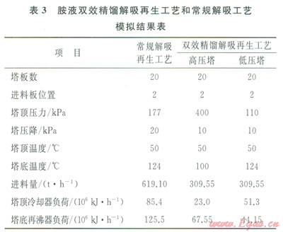 從損失分布圖可以發(fā)現(xiàn),由于雙效精餾過程將再生塔的外部損失合理利用,不僅大大降低了胺液解吸再生過程的熱量消耗,而且也降低了能損失,提高了整個(gè)胺液解吸再生過程的效率。將雙效精餾過程看成一個(gè)整體,其胺液解吸再生過程的效率為12.7%,較之于傳統(tǒng)流程單塔解吸過l2.7%,較之于傳統(tǒng)流程單塔解吸過程,效率提高了約27.0%。