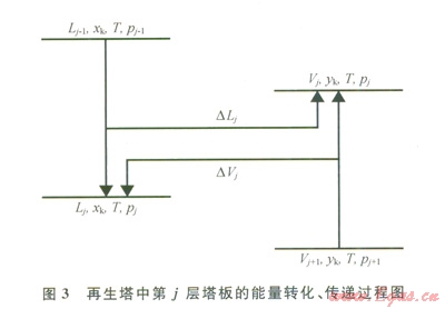 圖3表示再生塔中第j層塔板上能量的傳遞與轉(zhuǎn)換過程?,F(xiàn)以其作為研究對(duì)象,對(duì)該層塔板進(jìn)行分析。