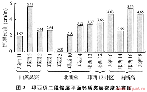 各斷塊鈣質(zhì)夾層發(fā)育密度由高到低依次是:南斷高、邛西12井區(qū)、西翼鼻突、北斷壘。根據(jù)小層劃分結(jié)果,統(tǒng)計(jì)鈣質(zhì)發(fā)育情況表明,縱向上,鈣質(zhì)夾層主要發(fā)育在儲(chǔ)層的中上部,且主要分布在泥質(zhì)層上下10~20m。各斷塊鈣層在平面上和縱向上具有零星分布特征,橫向連續(xù)性差,厚度變化大,結(jié)合鈣質(zhì)層上下儲(chǔ)層氯仿瀝青“A”地球化學(xué)特征具有一定差異性,認(rèn)為鈣質(zhì)夾層具有夾層特征,在部分地區(qū)部分層位具有一定封隔流體滲流的能力。