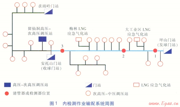 調(diào)度中心收集、匯總現(xiàn)場(chǎng)信息,計(jì)算分析清管器或檢測(cè)器實(shí)時(shí)速度,調(diào)整供氣門站、LNG應(yīng)急氣化站的流量,有效控制球速,滿足內(nèi)檢測(cè)作業(yè)的工藝要求。預(yù)測(cè)清管器或檢測(cè)器通過(guò)各分輸支線及收球門站的時(shí)間,提前通知廠站現(xiàn)場(chǎng)指揮組做好相應(yīng)操作準(zhǔn)備。通過(guò)調(diào)整清管器或檢測(cè)器的發(fā)球時(shí)間和速度,避免在供氣高峰時(shí)段關(guān)停重要的調(diào)壓站而影響下游供氣。在清管器或檢測(cè)器卡堵的應(yīng)急情況下,進(jìn)行管網(wǎng)運(yùn)行工況調(diào)整及供氣保障的氣量調(diào)度。