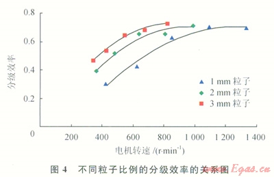 實(shí)驗(yàn)材料仍為直徑分別為1mm、2mm、3mm的好壞粒子的混合物,但好壞粒子混合比例變?yōu)?span lang="EN-US">1:1(體積比),得到分級(jí)效率和電機(jī)轉(zhuǎn)速之間的關(guān)系(圖4)。
