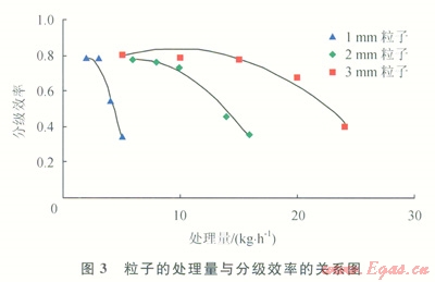 從圖3中可以看出,對(duì)于某一直徑的鋼粒子混合物,隨著粒子處理量的增加,分級(jí)效率呈現(xiàn)下降趨勢(shì);鋼粒子的直徑越小,其分級(jí)效率受處理量的影響越大。分析得出,出現(xiàn)該種情況的原因是大直徑完整粒子與破損粒子的質(zhì)量差異較大,小直徑完整粒子與破損粒子的質(zhì)量差異較小,該分離機(jī)分離好壞粒子的機(jī)理在于質(zhì)量的差異,因此也就出現(xiàn)了分選裝置處理粒子的能力和鋼粒子直徑相關(guān)的現(xiàn)象。