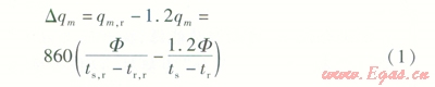 旁通管的管徑需要經(jīng)過(guò)計(jì)算確定,若設(shè)計(jì)供、回水溫度為ts、tr,設(shè)計(jì)質(zhì)量流量為qm,實(shí)際供、回水溫度為ts,r、tr,r實(shí)際質(zhì)量流量為qm,r,設(shè)計(jì)供暖熱負(fù)荷為F,則通過(guò)旁通管的多余質(zhì)量流量Dqm計(jì)算式為: