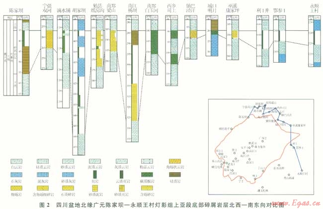 盆地北緣川北、陜南地區(qū)大致以漢南古陸為中心向其周緣,“碎屑巖層”由濱岸相石英砂巖相變?yōu)殛懪锵嗟纳百|(zhì)泥巖、盆地相的黑色頁巖與硅質(zhì)巖。緊鄰漢南古陸的南鄭縣梁山鎮(zhèn)地區(qū)以石英砂巖為主,自漢南古陸向西側(cè),勉縣紙房溝為石英砂巖夾砂質(zhì)泥巖,寧強(qiáng)縣胡家壩鎮(zhèn)地區(qū)為藍(lán)灰—紫紅色頁巖、泥質(zhì)云巖、黑灰色頁巖夾石英砂巖,寧強(qiáng)縣滴水鋪鄉(xiāng)地區(qū)為灰綠色砂質(zhì)頁巖,寧強(qiáng)縣雙河鄉(xiāng)地區(qū)為藍(lán)灰色砂質(zhì)云巖,廣元陳家壩相變?yōu)樯百|(zhì)頁巖,再往西到青川關(guān)莊等地則遭受剝蝕而缺失該套地層;自漢南古陸向東側(cè),南江楊壩為石英砂巖與深灰色泥巖,南鄭白玉河、西鄉(xiāng)司上為含泥質(zhì)云巖,鎮(zhèn)巴涇洋為次生角礫云巖(圖2)。
