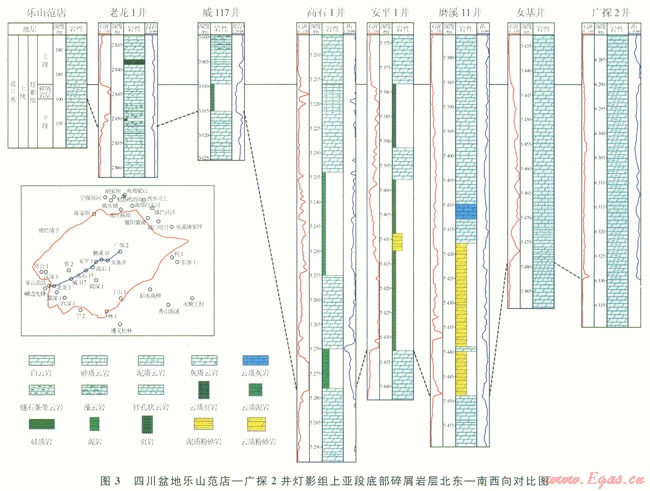 盆地南緣及川中地區(qū)主要以藍(lán)灰色泥巖、深灰色泥巖為主,并夾石英砂巖。峨邊先鋒為深灰色、黑色泥巖,樂山范店為泥質(zhì)云巖,老龍l井為深灰、黑灰色硅質(zhì)巖、泥質(zhì)云巖與頁巖,窩深l井、宮深l井為泥質(zhì)云巖,威117井為黑色、藍(lán)灰色泥巖,高石1井、安平l井為黑色頁巖夾薄層泥質(zhì)云巖,磨溪11井為石英細(xì)砂巖,到女基井為砂質(zhì)云巖(圖3)。