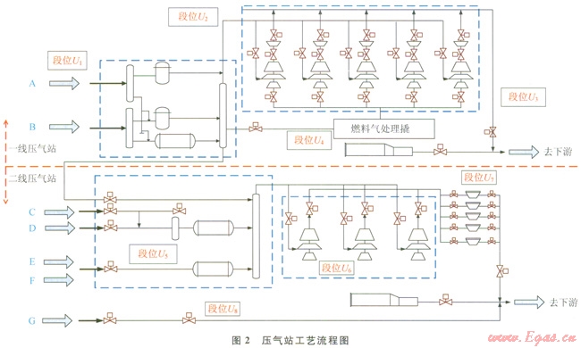 某壓氣站包括一線工程和二線工程。其中,一線有2路來氣,設(shè)計(jì)輸量為120×108m3/a(在0℃,l個(gè)標(biāo)準(zhǔn)大氣壓下的氣體體積)。二線有5路來氣,設(shè)計(jì)輸量為l20×108m3/a。各路來氣壓力約為4MPa,一線經(jīng)過壓縮機(jī)組加壓后壓力約為6.4MPa,二線經(jīng)加壓后壓力上升為9.6MPa。根據(jù)壓氣站的工藝關(guān)斷閥和ESD閥的設(shè)置情況,將該站場(chǎng)分為8個(gè)工藝段位,分別見壓氣站工藝流程圖2和表l所示。
