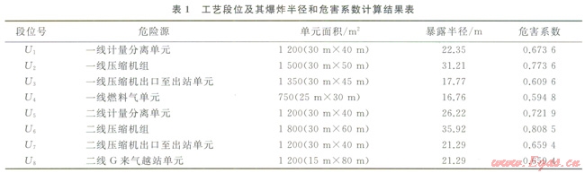 工藝段位(Section)的劃分,除了可以根據(jù)圖2中的各關(guān)斷位置之外,還可以根據(jù)工藝單元或者參考HAZOP報(bào)告的節(jié)點(diǎn)來劃分。本例的主要危害后果是天然氣泄漏之后的潛在火災(zāi)爆炸,因此根據(jù)道化F&E指數(shù)計(jì)算流程分別對(duì)各工藝段位進(jìn)行計(jì)算,結(jié)果如表1所示。