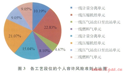 根據(jù)表1的數(shù)據(jù),由式(2)計(jì)算相對(duì)危險(xiǎn)系數(shù)RH∽并按照?qǐng)D1的流程進(jìn)行第一層的風(fēng)險(xiǎn)準(zhǔn)則額度分解,得到各工藝段位的RTCU值,如表2所示。各段位的風(fēng)險(xiǎn)額度比例如圖3所示。從中可見,一線和二線的壓縮機(jī)組單元的RTCU值占比最大,兩者合計(jì)接近44%。表明壓縮機(jī)單元的風(fēng)險(xiǎn)較大,因此所分配的個(gè)人風(fēng)險(xiǎn)容許準(zhǔn)則也相對(duì)較大。這與從風(fēng)險(xiǎn)經(jīng)濟(jì)學(xué)的角度看也是合理的,有利于從全局的角度優(yōu)化風(fēng)險(xiǎn)處置的成本。