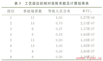 得到各工藝段位的風(fēng)險(xiǎn)準(zhǔn)則額度后,按照?qǐng)D1所示的第二階段計(jì)算流程,就可以得到某一工藝段位的各事故場(chǎng)景RTCS。為此需要統(tǒng)計(jì)該站場(chǎng)內(nèi)的人員分布情況,具體包括站長(zhǎng)、自控工程師、設(shè)備工程師、通訊工程師、電氣工程師、運(yùn)行人員、保管和門衛(wèi)等8類人員。這里各類人員都是當(dāng)作假想人員來加權(quán)考慮的,以避免某一類別的人員數(shù)增加而導(dǎo)致風(fēng)險(xiǎn)評(píng)估中的Salami切片現(xiàn)象[3]。可信的事故場(chǎng)景數(shù)根據(jù)該站場(chǎng)的HAZOP分析報(bào)告確定,此外本例中為簡(jiǎn)化起見,令參數(shù)UFU=1。根據(jù)式(4)和式(5)計(jì)算得到最終所需要的事故場(chǎng)景定量風(fēng)險(xiǎn)容許準(zhǔn)則值RTCU,如表3所示。