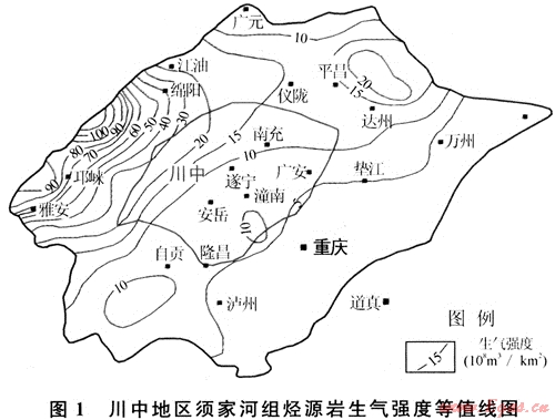 川中地區(qū)須家河組為一套自生自儲(chǔ)的氣藏,須一段、須三段、須五段暗色泥巖層夾煤層是主要烴源巖,源巖中有機(jī)質(zhì)極為豐富,具有形成大氣田的物質(zhì)基礎(chǔ);烴源巖厚度較大,暗色泥質(zhì)源巖厚度超過(guò)100m;烴源巖總厚度一般超過(guò)130m,局部地區(qū)大于300m,煤巖總厚度超過(guò)3m,具多層分布的特點(diǎn),部分井可達(dá)數(shù)層,煤巖單層厚度為0.2~1m;烴源巖有機(jī)碳豐度普遍較高,平均為1.76%,以腐殖型干酪根為主,川中地區(qū)發(fā)育最好的3套烴源以須五段最好,須三段次之,須一段厚度較薄。盡管川中地區(qū)每套烴源巖生氣強(qiáng)度偏低,平均生氣強(qiáng)度為12.1×108m3/km2(圖1),但其烴源巖厚度較大、有機(jī)質(zhì)含量高、分布范圍大、構(gòu)造平緩、中深埋藏、保存條件良好,為須二、須四、須六段天然氣富集成藏提供了豐富的物質(zhì)基礎(chǔ),具備形成大中型氣藏的氣源條件。