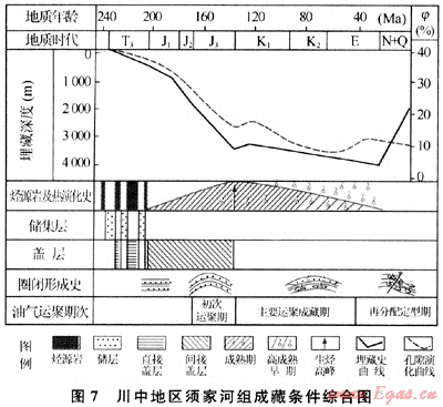 川中地區(qū)須家河組生、儲(chǔ)層在沉積后的地史中長(zhǎng)期處于中深埋藏,古今構(gòu)造平緩,受力較弱,保存封閉條件良好,這為油氣的生存與油氣成藏富集提供了良好地質(zhì)條件。川中地區(qū)須家河組油氣成藏富集可劃分為3期(圖7):①晚侏羅世末為油氣初始排烴、運(yùn)聚成藏期,烴源巖處于生油氣早期階段,油氣垂向運(yùn)移到須家河組各孔隙性儲(chǔ)層內(nèi),同時(shí)烴源巖演化生成油氣時(shí)還產(chǎn)生一種有機(jī)酸,其對(duì)儲(chǔ)層的孔隙具有建設(shè)性改造作用(溶蝕作用),從而增加了砂巖儲(chǔ)集空間體積。由于儲(chǔ)層孔、滲條件得到改善,已形成的古圈閉所處的低勢(shì)環(huán)境能優(yōu)先捕獲這一時(shí)期的油氣并聚集成藏;②白堊紀(jì)-古近紀(jì)為油氣主要聚集成藏期,此時(shí)期烴源巖已進(jìn)入生油氣高峰,生成的油氣首先向就近儲(chǔ)集體中運(yùn)移,并與早期進(jìn)入儲(chǔ)層的油氣匯聚成藏;③喜山期以來(lái)為油氣成藏調(diào)整期,喜山運(yùn)動(dòng)期間形成一系列新圈閉,并最終使圈閉定型,產(chǎn)生斷層及其伴生裂縫,烴類發(fā)生轉(zhuǎn)移、調(diào)整和再分配,這一成藏期為新圈閉捕獲油氣創(chuàng)造了條件。