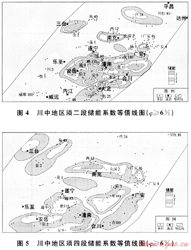 就須二段來(lái)看,高儲(chǔ)能系數(shù)分布區(qū)主要在金華-充西-營(yíng)山構(gòu)造帶以及川中-川南過(guò)渡帶相對(duì)連續(xù)并具一定規(guī)模,如合川、潼南、遂南、磨溪區(qū)決(圖4);須四段高儲(chǔ)能系數(shù)區(qū)主要分布在川中西北部-廣安一帶、磨溪-潼南一帶(圖5);須六段高儲(chǔ)能系數(shù)區(qū)除主要分布在廣安Ⅰ號(hào)區(qū)塊,其他地區(qū)僅零星分布(圖6)。因此,須家河組各亞段高儲(chǔ)能系數(shù)分布范圍較大,具有較大勘探開(kāi)發(fā)潛力。