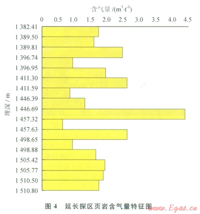 與常規(guī)天然氣類似,要構(gòu)成一定的儲量規(guī)模,頁巖氣必須具備充足的氣源條件,但這并不意味著其氣源條件狹窄,對地質(zhì)、地球化學等指標仍有定量上的要求。在頁巖規(guī)模確定的前提下,含氣量的大小是決定探區(qū)是否具有商業(yè)開采價值的關(guān)鍵。含氣量的大小一方面受控于儲集空間的發(fā)育程度,另一方面受控于烴源巖的生氣能力,而最終決定頁巖生氣能力的是有機質(zhì)的豐度、類型和成熟度。有機質(zhì)的豐度、類型和成熟度在一定程度上具有生氣互補性,例如腐泥型母質(zhì)在熱演化程度較低時也可以生氣,而腐殖型母質(zhì)在高演化程度下才可能生成同等的氣量[3]。同理,含氣量的大小是各種地球化學參數(shù)指標綜合作用的結(jié)果。延長探區(qū)內(nèi)1井與2井具有相同的母質(zhì)類型(以混合型為主),但l井的有機碳含量為2.2%,鏡質(zhì)體反射率為0.88%,孔隙度為0.25%;而2井的有機碳含量為3.9%,鏡質(zhì)體反射率為1.0l%,孔隙度為0.11%,孔隙度極小。然而,2口井頁巖的含氣量卻大致相當(均接近3.5m3/t)。由此可見,地球化學指標上的差異并不代表頁巖整體含氣性的差異,當某個地球化學指標條件差時,若其他指標較好仍可能具有可觀的含氣量。因此,在進行頁巖氣地質(zhì)評價時,不能采用單一的地球化學指標來進行判別。