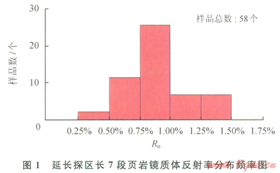 延長探區(qū)長7段頁巖埋深變化大(500~1800m)、構(gòu)造演化歷史和熱作用歷史存在差異,其現(xiàn)今的熱成熟度變化亦較大。長7段頁巖的鏡質(zhì)體反射率變化范圍為0.25%~l.50%,基本上涵蓋了生物作用生甲烷氣、熱降解作用生油氣和高溫熱裂解生氣3個生烴階段,但以熱降解作用階段為主(圖1)。因此,從成因類型上看,長7段頁巖氣包括生物作用成因、熱降解成因和高溫熱裂解成因3種類型。