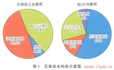 眾所周知,非常規(guī)油氣開(kāi)發(fā)的經(jīng)濟(jì)效益取決于成本的控制,北美取得頁(yè)巖氣開(kāi)發(fā)的成功正是由于采用了低成本的清水壓裂[4]。但以勝利油田某非常規(guī)頁(yè)巖油氣井的壓裂開(kāi)采預(yù)算為例(圖1),不難看出,國(guó)外公司的完井工具、壓裂材料(壓裂液和支撐劑)以及技術(shù)服務(wù)費(fèi)用占據(jù)全部壓裂費(fèi)用的44.4%,其中,壓裂液的費(fèi)用又占BJ公司全部預(yù)算的57%。兇此,目前的非常規(guī)油氣開(kāi)發(fā)模式難以取得經(jīng)濟(jì)效益,從長(zhǎng)遠(yuǎn)角度出發(fā),必須要有大量的資金和科研力量投入到非常規(guī)油氣開(kāi)采的基礎(chǔ)研究上,從完井工具、壓裂液和支撐劑以及相關(guān)技術(shù)上打破國(guó)外技術(shù)壟斷。提升壓裂開(kāi)采的軟件實(shí)力,才能有效控制開(kāi)發(fā)成本,取得并提高經(jīng)濟(jì)效益。