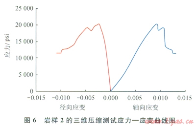 三維壓縮實(shí)驗(yàn)應(yīng)力 應(yīng)變曲線如圖5、6所示。巖石材料的塑性與脆性可根據(jù)應(yīng)力、應(yīng)變曲線上負(fù)坡的坡降大小來劃分。負(fù)坡較陡者為脆性,反之為塑性。由圖5、6可知:巖樣1和巖樣2在應(yīng)力分別為l2000psi(1psi=6.895kPa)和20000psi時(shí),應(yīng)變?yōu)?span lang="EN-US">0.01、0.009時(shí)破碎,屬于脆性巖石,且?guī)r樣2應(yīng)力、應(yīng)變曲線上的負(fù)坡較陡,故其脆性優(yōu)于巖樣1。