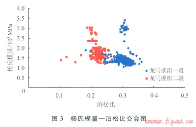 整體龍馬溪組楊氏模量介于l×104~3.5×104MPa,平均為2.3×104MPa;泊松比介于0.1~0.37,平均為0.24。通過圖3可以看出,龍馬溪組一段楊氏模量平均值為1.4×104MPa,泊松比平均值為0.3;龍馬溪組二段楊氏模量平均值為l.8×104MPa,泊松比平均值為0.23。龍馬溪組二段較龍馬溪組一段具有低泊松比,高楊氏模量,說明其脆性優(yōu)于一段。圖4為橫縱波時(shí)差比和泊松比的交會(huì)圖,可以看出龍馬溪組二段的橫縱波時(shí)差比明顯低于一段,說明低橫縱波時(shí)差比參數(shù)用于表征頁巖的脆性程度是有效的。
