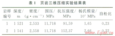 通過巖石力學(xué)實(shí)驗(yàn),龍馬溪組二段頁巖儲(chǔ)層基質(zhì)巖石,抗壓強(qiáng)度分布在91~152MPa,平均抗壓強(qiáng)度為121.98MPa,平均楊氏模量為2.15×104MPa,平均泊松比為0.23(表1)。測(cè)試數(shù)據(jù)分析結(jié)果可知,巖樣2對(duì)比巖樣l具有低泊松比和高楊氏模量的特征,說明龍馬溪組二段在深度1541m時(shí),頁巖脆性程度最優(yōu),與先前的礦物分析和脆性指數(shù)得到的結(jié)論相符。