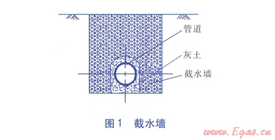 a.如果地貌允許(如荒地),首先進(jìn)行分階削方處理,使管道通過處的坡度≤30°;其次在有可能產(chǎn)生積水或高跌水的位置,考慮設(shè)置漿砌塊石截水墻(見圖l)、排水溝,將水疏導(dǎo)至遠(yuǎn)離管道的地方,避免出現(xiàn)漏斗、溶洞以及對(duì)管溝產(chǎn)生沖蝕。