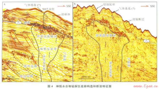 氣煙囪(流體底辟)的出現(xiàn)一般代表了氣體在一個(gè)密閉條件很差的環(huán)境中,烴類聚集過(guò)程中的遷移[14]。從世界上典型水合物富集區(qū)的調(diào)查研究結(jié)果來(lái)看,水合物的存在往往和氣煙囪具有密切的關(guān)系[15-17]。在神狐水合物鉆探區(qū),氣煙囪非常發(fā)育,且和BSRs(似海底反射,bottom simulating reflectors)分布具有一定的匹配關(guān)系,在鉆前預(yù)測(cè)中被作為水合物存在的證據(jù)之一(圖3) [18]。在地震剖面上,由于氣煙囪內(nèi)氣體濃度和圍巖的差異所導(dǎo)致的速度異常,可以觀察到明顯的反射特征差異,整體的形態(tài)為直立狀,并使得地震反射具有雜亂、模糊和空白反射的特征。在氣煙囪的頂部,可以觀察到一“強(qiáng)振幅反射區(qū)”,其存在可能暗示了氣煙囪的頂部存在游離氣(圖4)。盡管在部分地震剖面上,BSR的強(qiáng)反射軸和氣煙囪頂部的強(qiáng)反射軸因?yàn)橹丿B而難以區(qū)分,但是二者具有明顯的區(qū)別:①規(guī)模不同,前者是反射層,而后者是反射區(qū);②形成原因不同,前者是由于底部的游離氣聚集而產(chǎn)生的波阻抗差導(dǎo)致,而后者是由于流體對(duì)氣煙囪頂部的充填而產(chǎn)生的地震波高頻信號(hào)吸收導(dǎo)致;③意義不同,前者只是一個(gè)物理界面,是大波阻抗差的體現(xiàn),而后者是地層區(qū)塊,是流體充注的結(jié)果。
