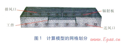 在模擬計(jì)算供暖熱負(fù)荷時(shí),僅考慮3m高度以下的主要工作區(qū)域。噴涂車(chē)間冬季室外供暖計(jì)算溫度為-9.8℃,供暖室內(nèi)設(shè)計(jì)溫度為23℃,設(shè)計(jì)供暖熱負(fù)荷為442848W。選取14塊輻射板,每塊輻射板長(zhǎng)36.5m,熱水進(jìn)、出口溫度為93、73℃,總流量為19m3/h。輻射板表面溫度為47℃,單位長(zhǎng)度輻射板散熱量為867W/m,總散熱量為443100W。輻射板安裝高度為11.4m,與最長(zhǎng)的外墻平行放置,靠墻第一排輻射板距墻0.5m3。為簡(jiǎn)化計(jì)算,視每塊輻射板內(nèi)熱水分布均一,僅在流固交界面處有溫度變化。