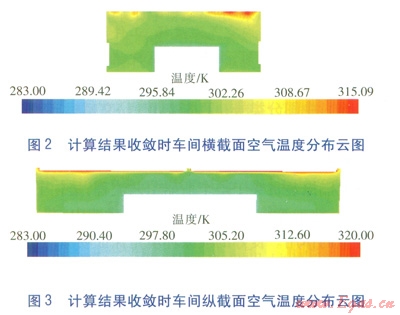 由于噴涂車(chē)間的溫度與氣流組織分布主要體現(xiàn)在車(chē)間內(nèi)部的流體區(qū)域,因此在模擬計(jì)算前對(duì)模型進(jìn)行抽取內(nèi)部流體空間處理。計(jì)算結(jié)果收斂時(shí)車(chē)間橫截面(中間位置)、縱截面(中間位置)的空氣溫度分布云圖分別見(jiàn)圖2、3。由圖2、3可知,車(chē)間室內(nèi)空氣溫度范圍為25~27℃,接近熱源處溫度較高(在36℃左右)。沿高度方向溫度梯度較小,溫度分布均勻,符合輻射供暖的特點(diǎn)。